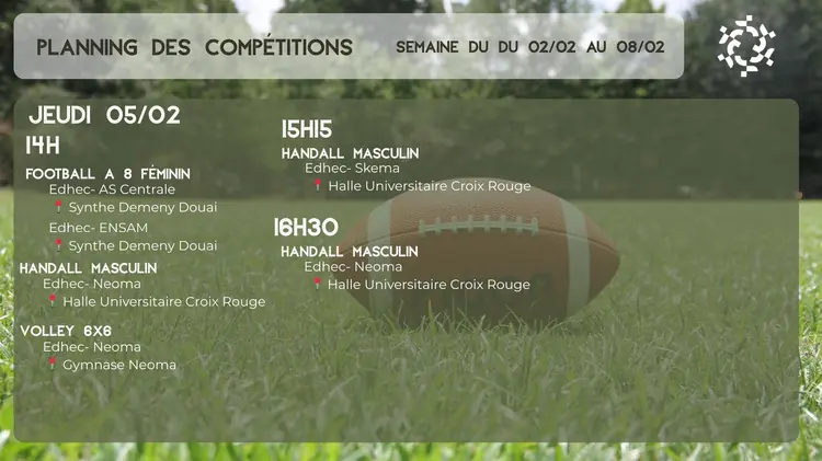 Voici le planning des compétitions du 02/02 au 08/02.