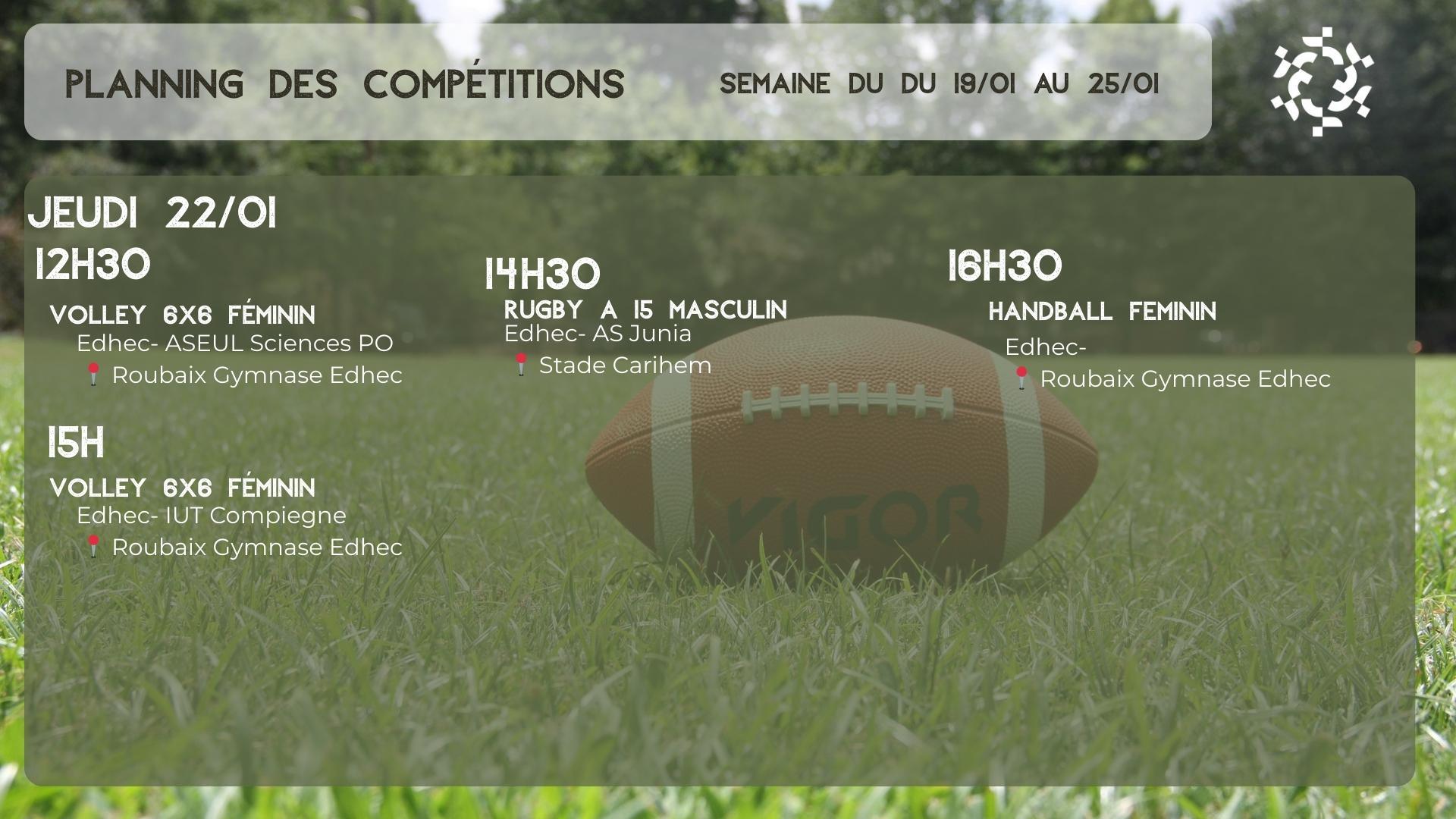 Voici le planning des compétitions du 19/01 au 25/01. De nombreux matchs se déroulent sur le campus, c'est pourquoi nous vous invitons à venir soutenir votre équipe !